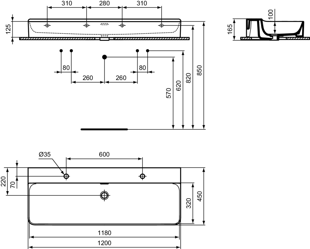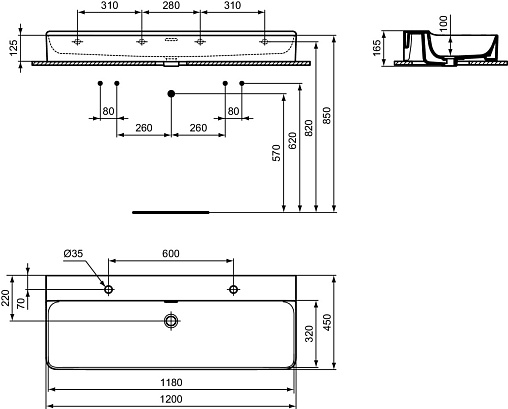 Подвесная раковина Conca 120х45х16,5 см, санфарфор, двойная, с отв. под смеситель, Ideal Standard