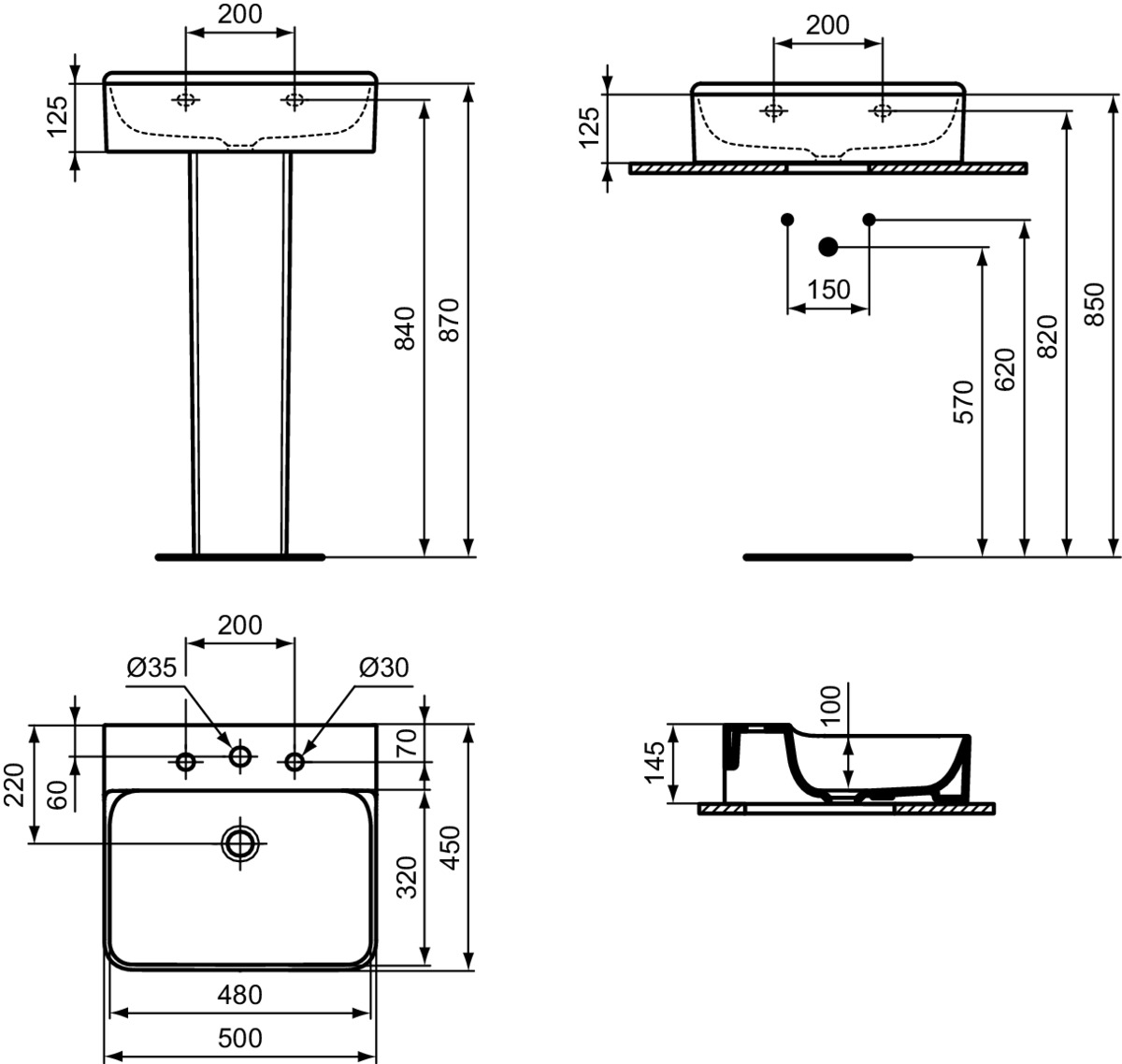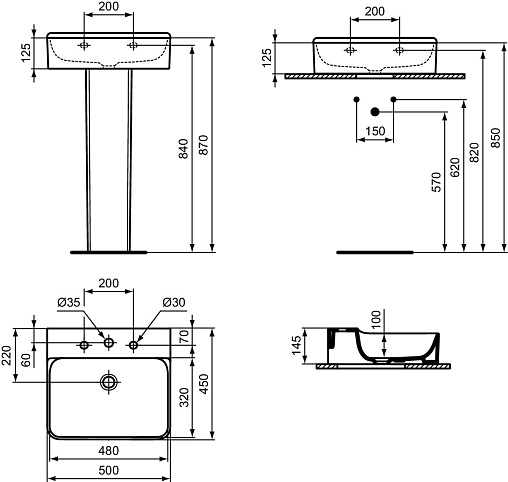 Подвесная раковина Conca 50х45х14,5 см, с 3 отверстиями под смеситель, санфарфор, с отв. под смеситель, Ideal Standard