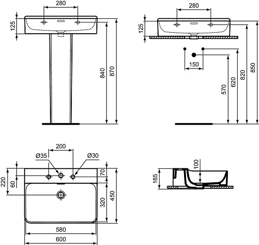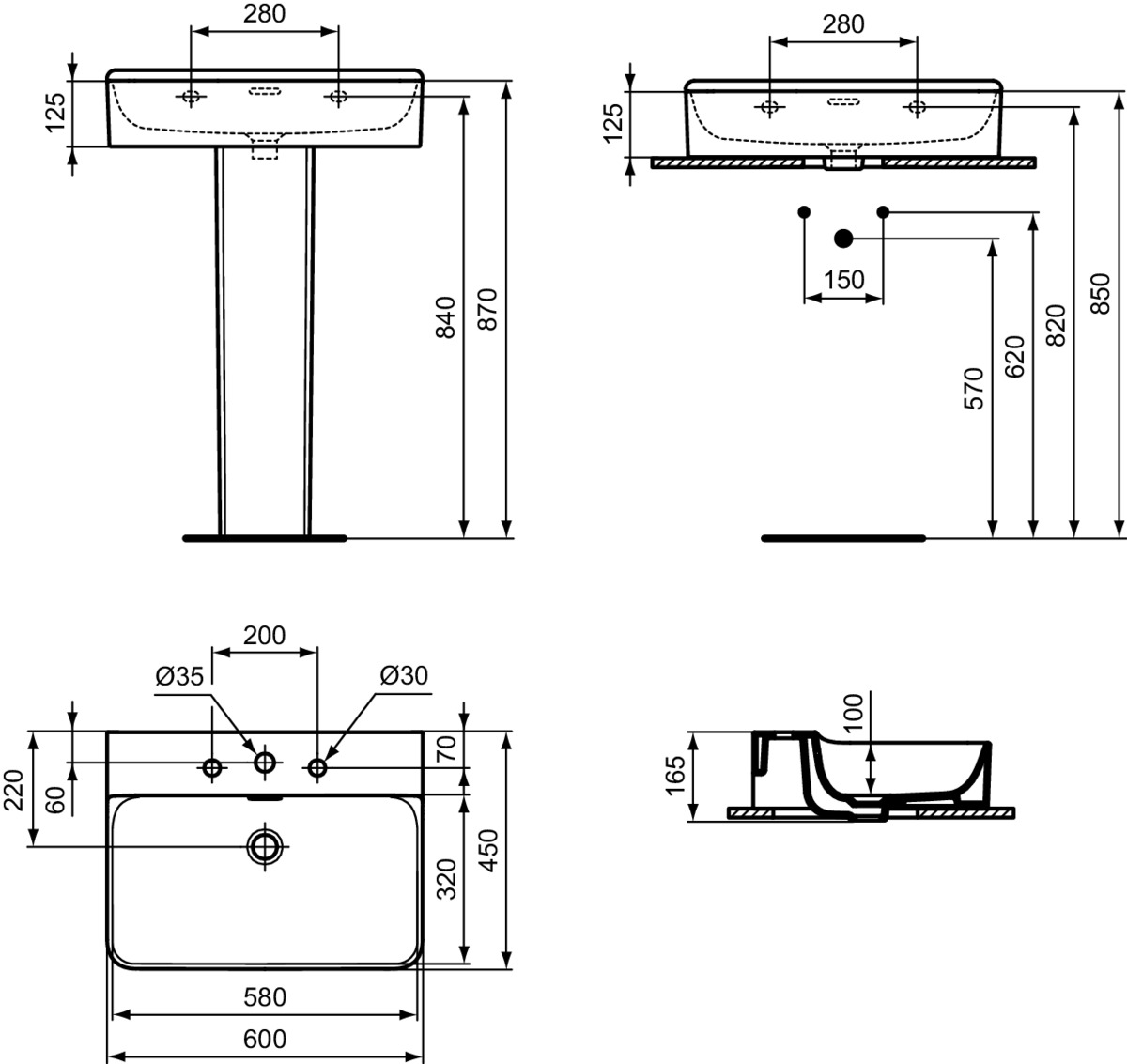 Подвесная раковина Conca 60х45х12,5 см, с 3 отверстиями под смеситель, санфарфор, с отв. под смеситель, Ideal Standard