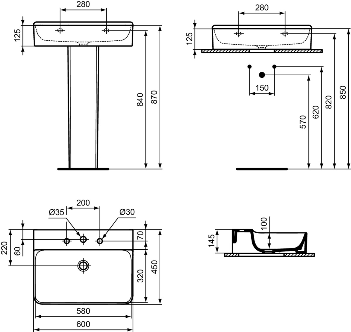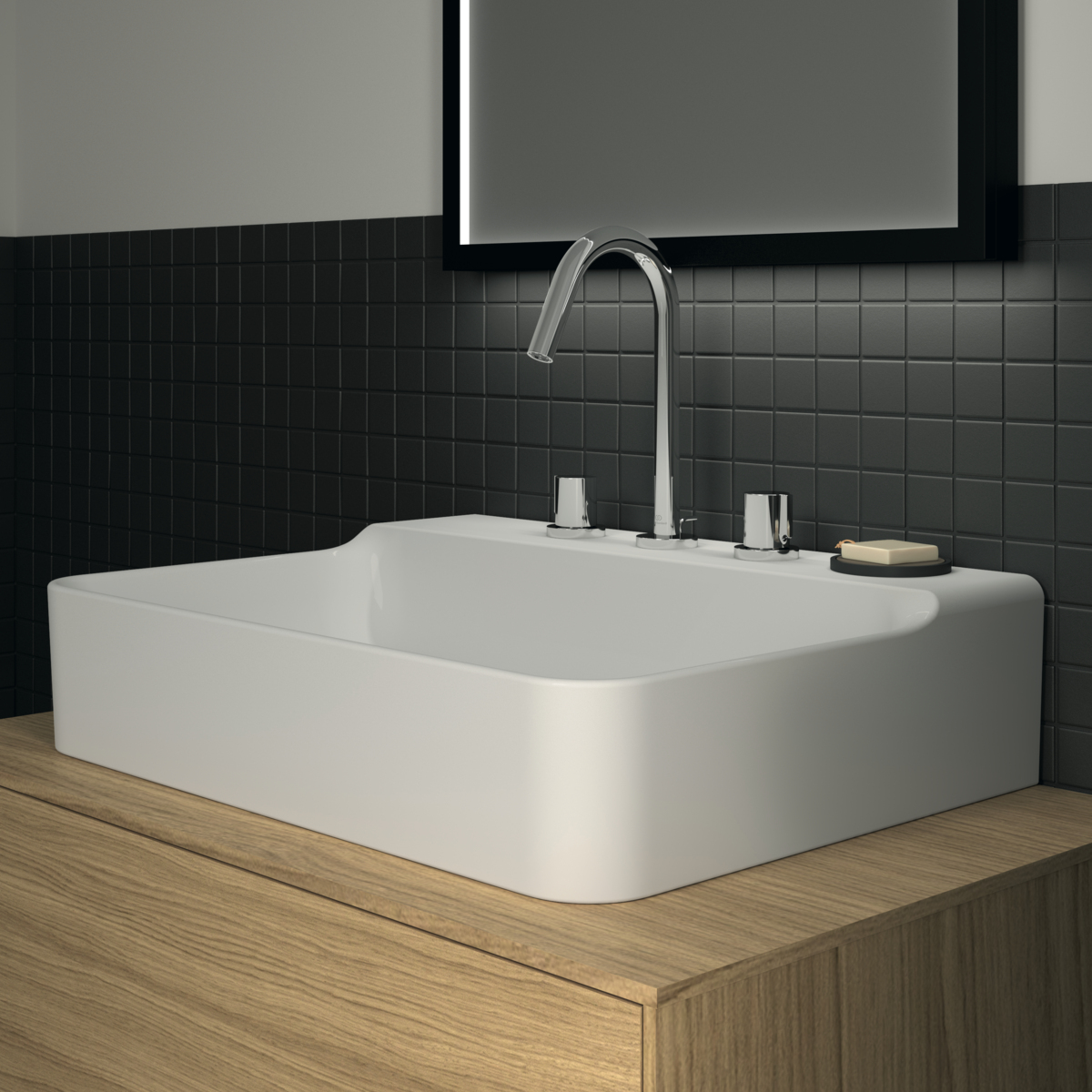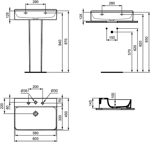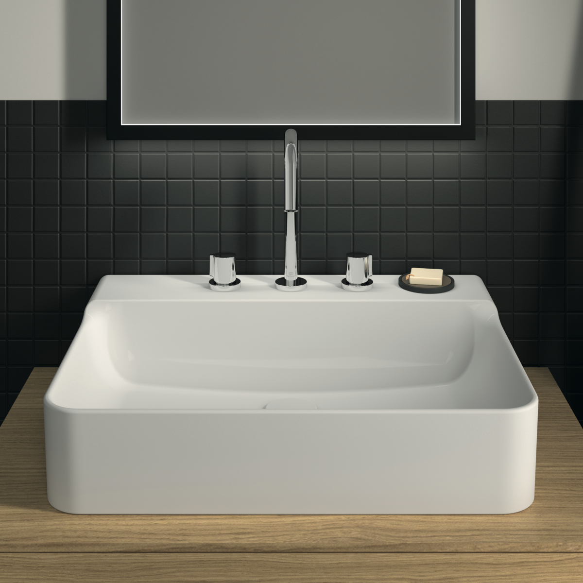 Подвесная раковина Conca 60х45х14,5 см, с 3 отверстиями под смеситель, без отверстия перелива, нижняя поверхность отшлифована, санфарфор, с отв. под смеситель, Ideal Standard