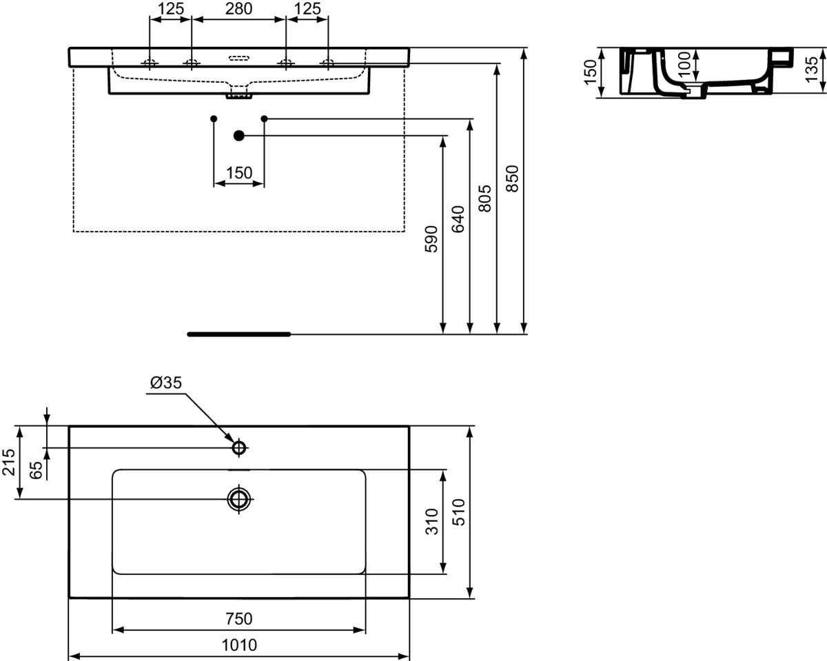 Подвесная раковина Extra 101х51х15 см, санфарфор, белый матовый, с отв. под смеситель, Ideal Standard