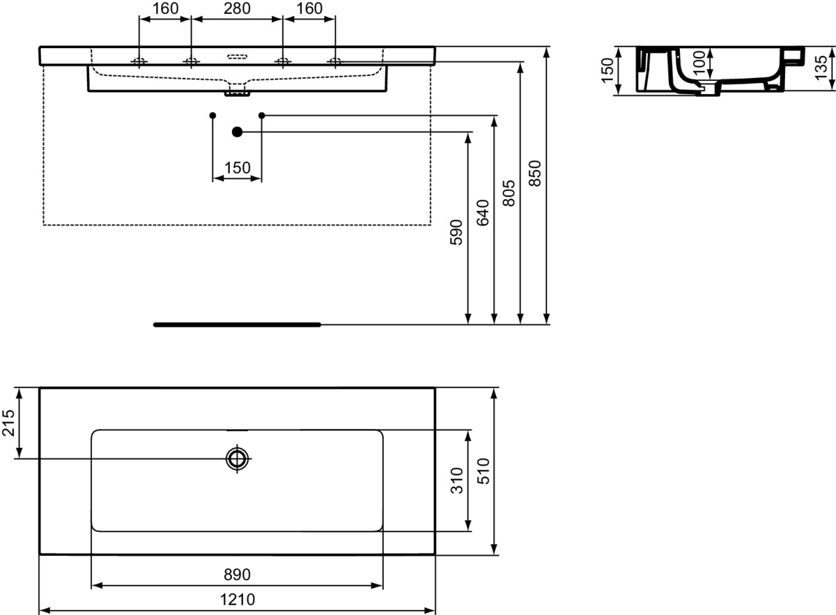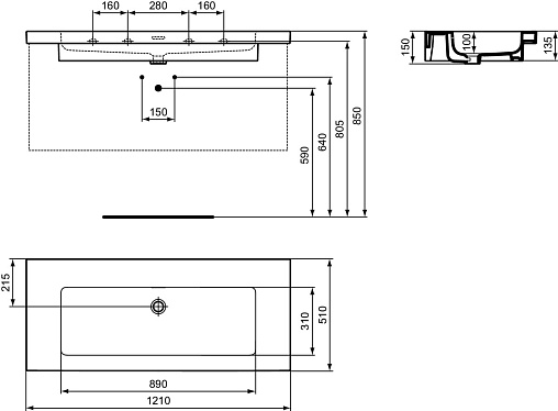Подвесная раковина Extra 121х51х15 см, санфарфор, Ideal Standard