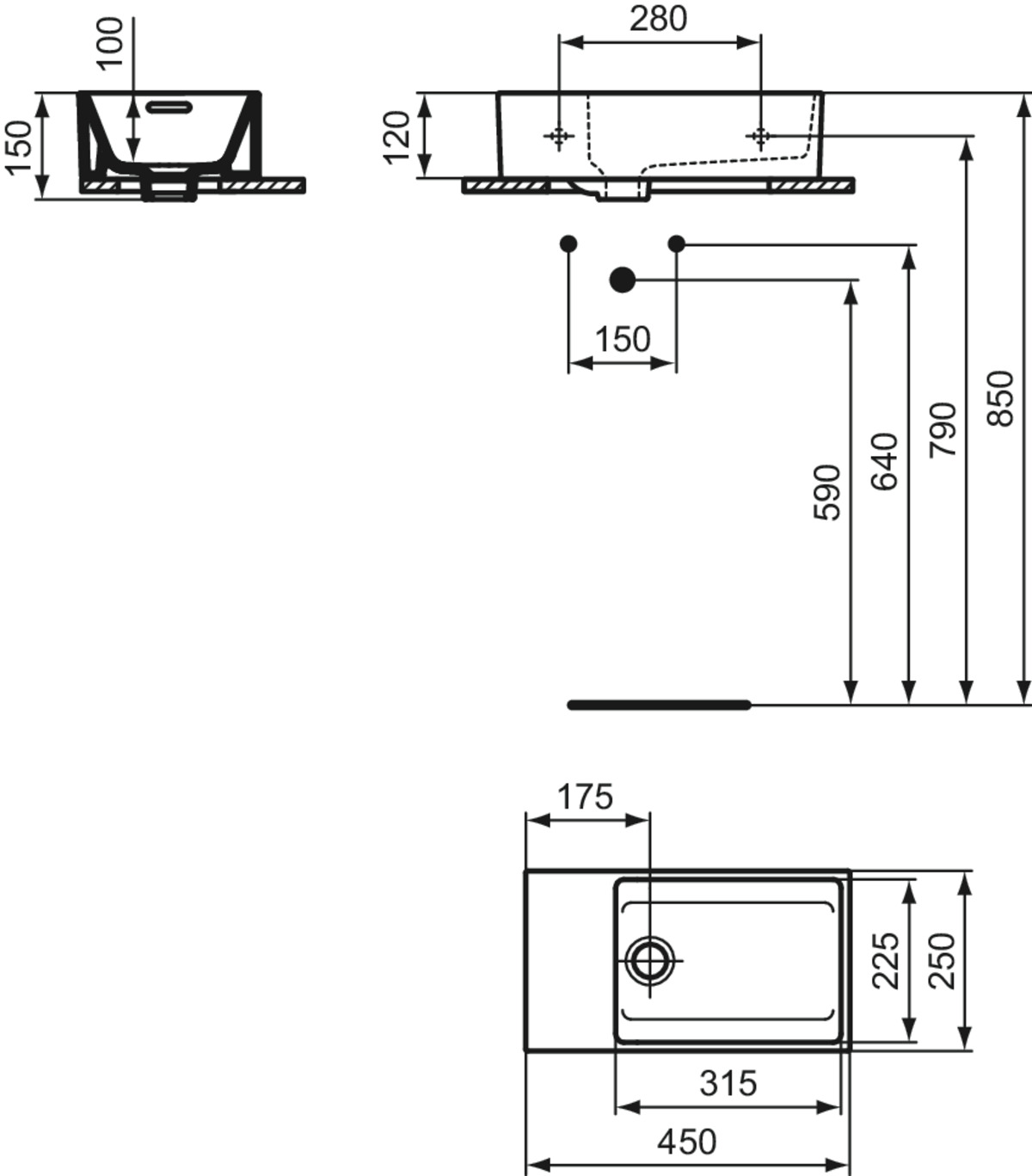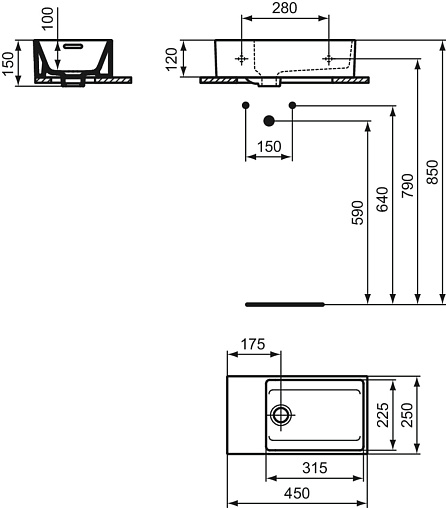 Подвесная раковина Extra 45х25х12 см, левая, нижняя поверхность отшлифована, санфарфор, Ideal Standard