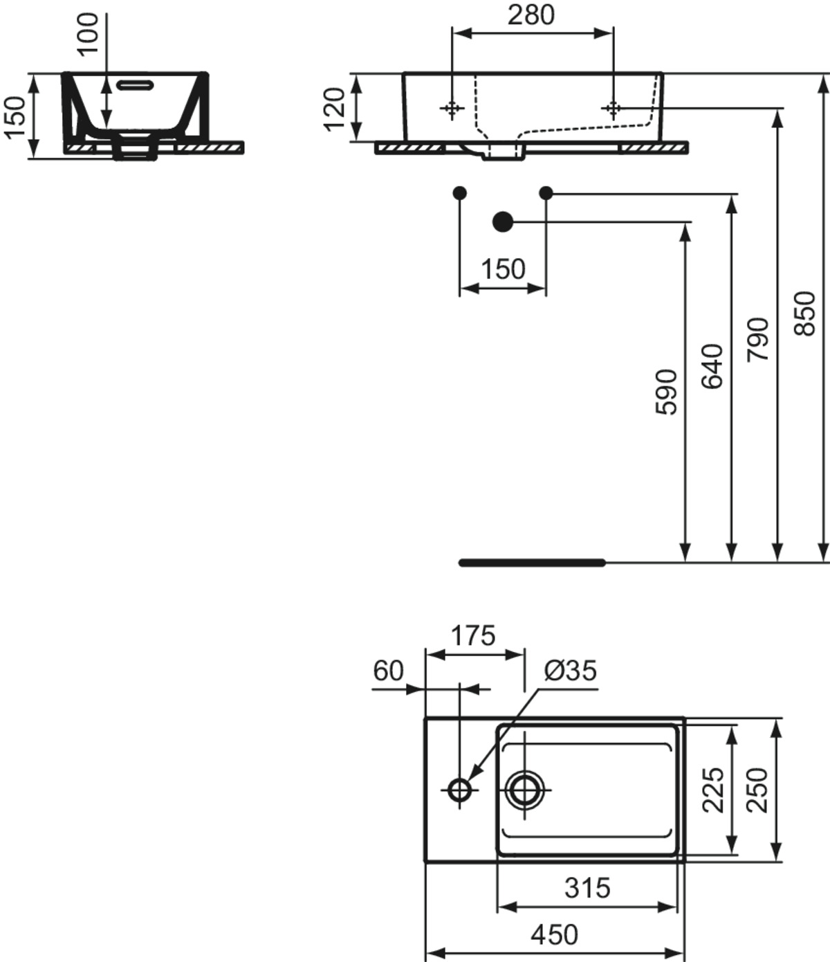 Подвесная раковина Extra 45х25х15 см, нижняя поверхность отшлифована, отверстие слева, санфарфор, с отв. под смеситель, Ideal Standard