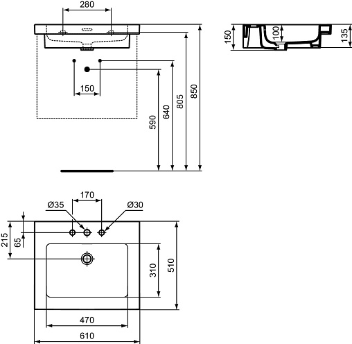 Подвесная раковина Extra 61х51х15 см, с 3 отверстиями под смеситель, санфарфор, с отв. под смеситель, Ideal Standard