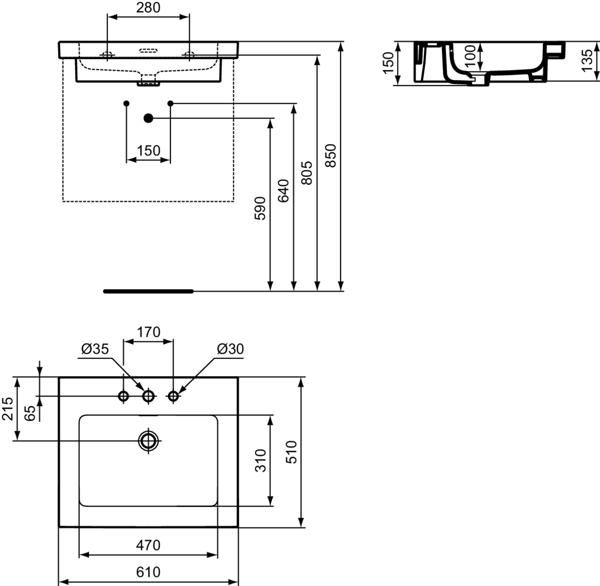 Подвесная раковина Extra 61х51х15 см, с 3 отверстиями под смеситель, санфарфор, с отв. под смеситель, Ideal Standard