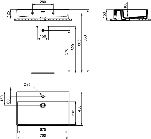 Подвесная раковина Extra 70х45х15 см, нижняя поверхность отшлифована, санфарфор, с отв. под смеситель, Ideal Standard