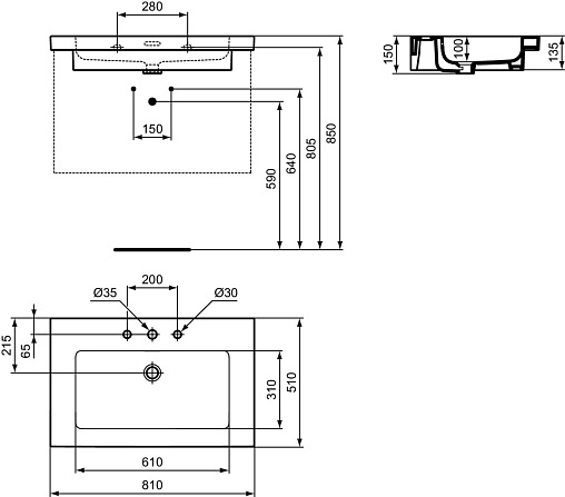 Подвесная раковина Extra 81х51х15 см, с 3 отверстиями под смеситель, санфарфор, с отв. под смеситель, Ideal Standard