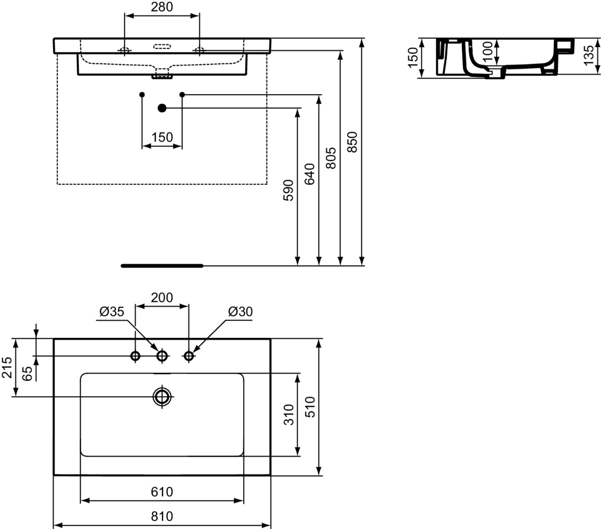 Подвесная раковина Extra 81х51х15 см, с 3 отверстиями под смеситель, санфарфор, с отв. под смеситель, Ideal Standard
