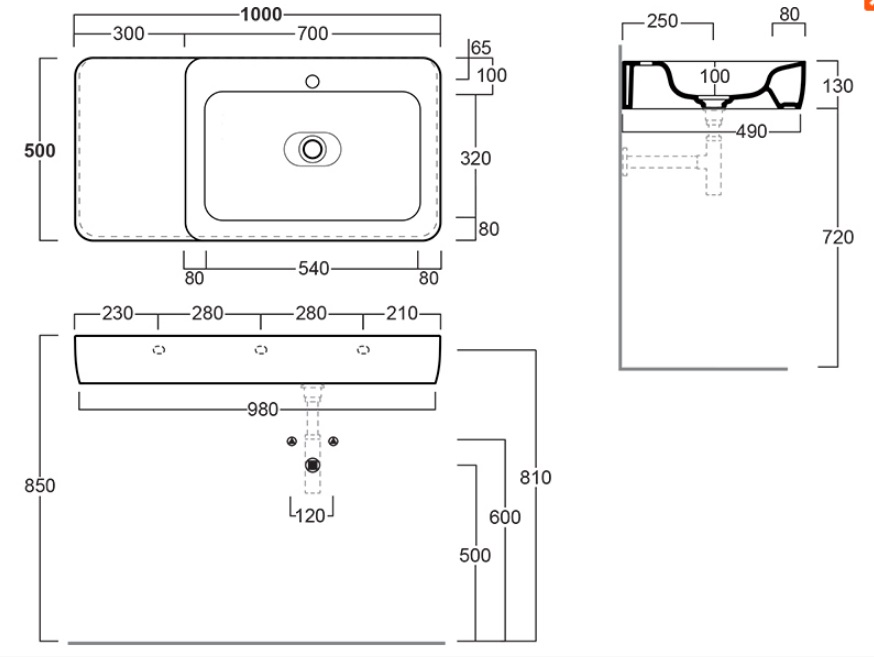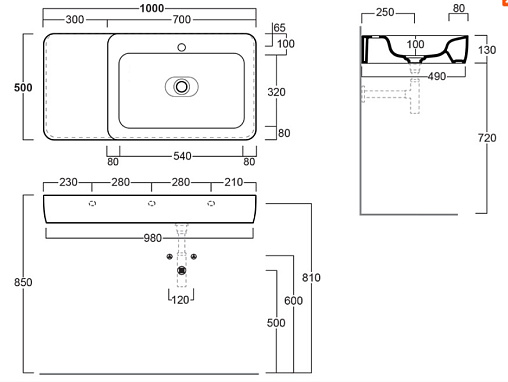 Подвесная раковина Henges 100х50х13 см, (подвесная/накладная), санфарфор, с отв. под смеситель, Simas