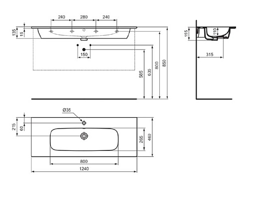 I.life A 124х46х13,5см, подвесная раковина, санфарфор, с отв. под смеситель, арт. T462201, Ideal Standard