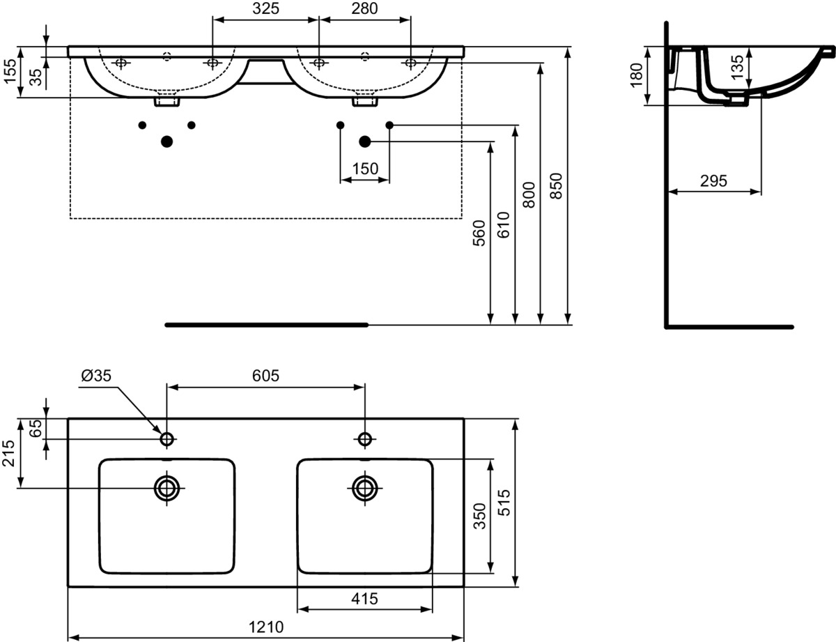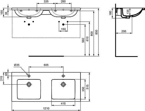 Подвесная раковина I.life B 120,5х51,5х15,5 см, санфарфор, двойная, с отв. под смеситель, Ideal Standard