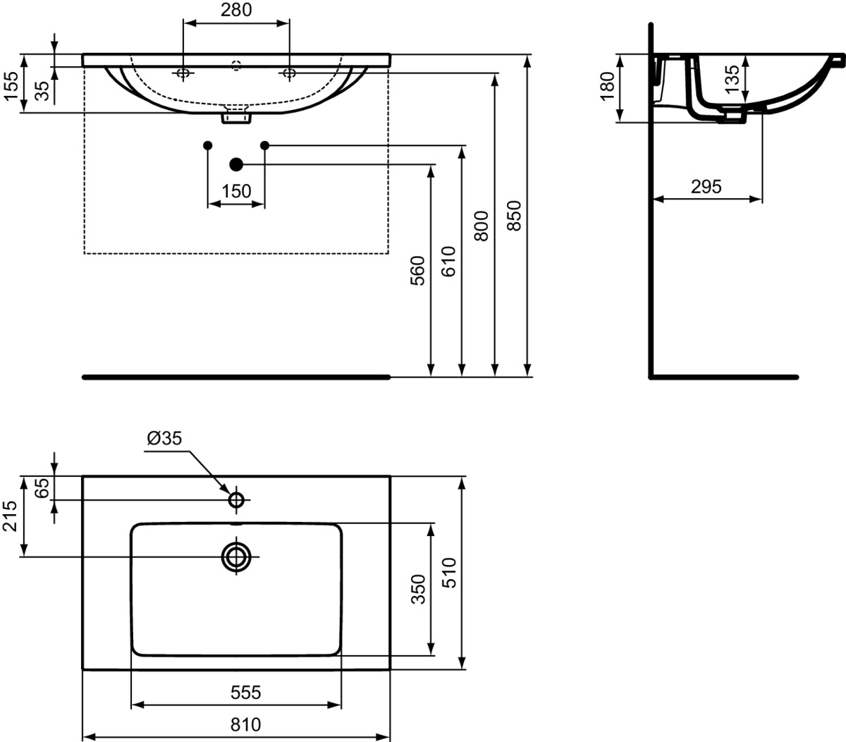 Ideal Standard i.life B Vanity раковина 81x51 см для монтажа с мебелью или соло с дизайн-сифоном, с отверстием под смеситель, с отверстием перелива. Без крепежа, рекомендуемый крепеж WW965340
