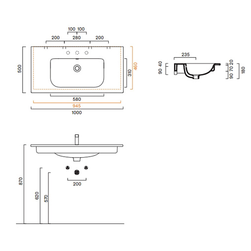 Подвесная раковина Italy 100х50х18 см, санфарфор, с отв. под смеситель, Catalano