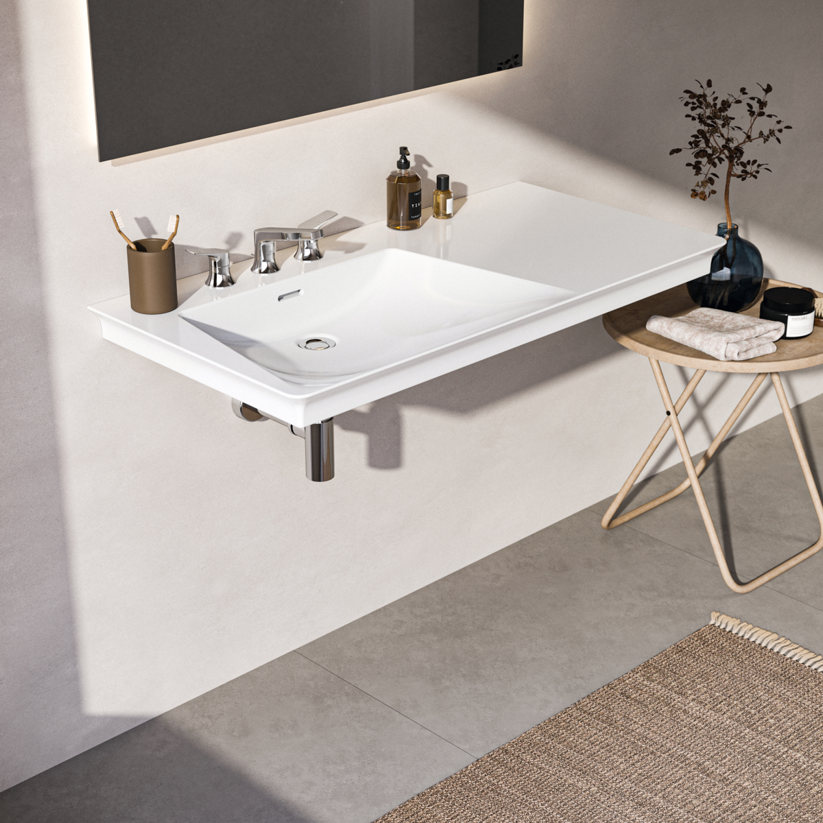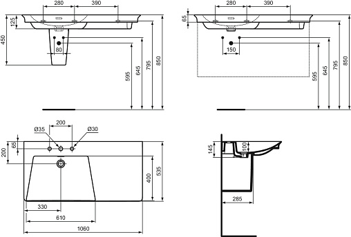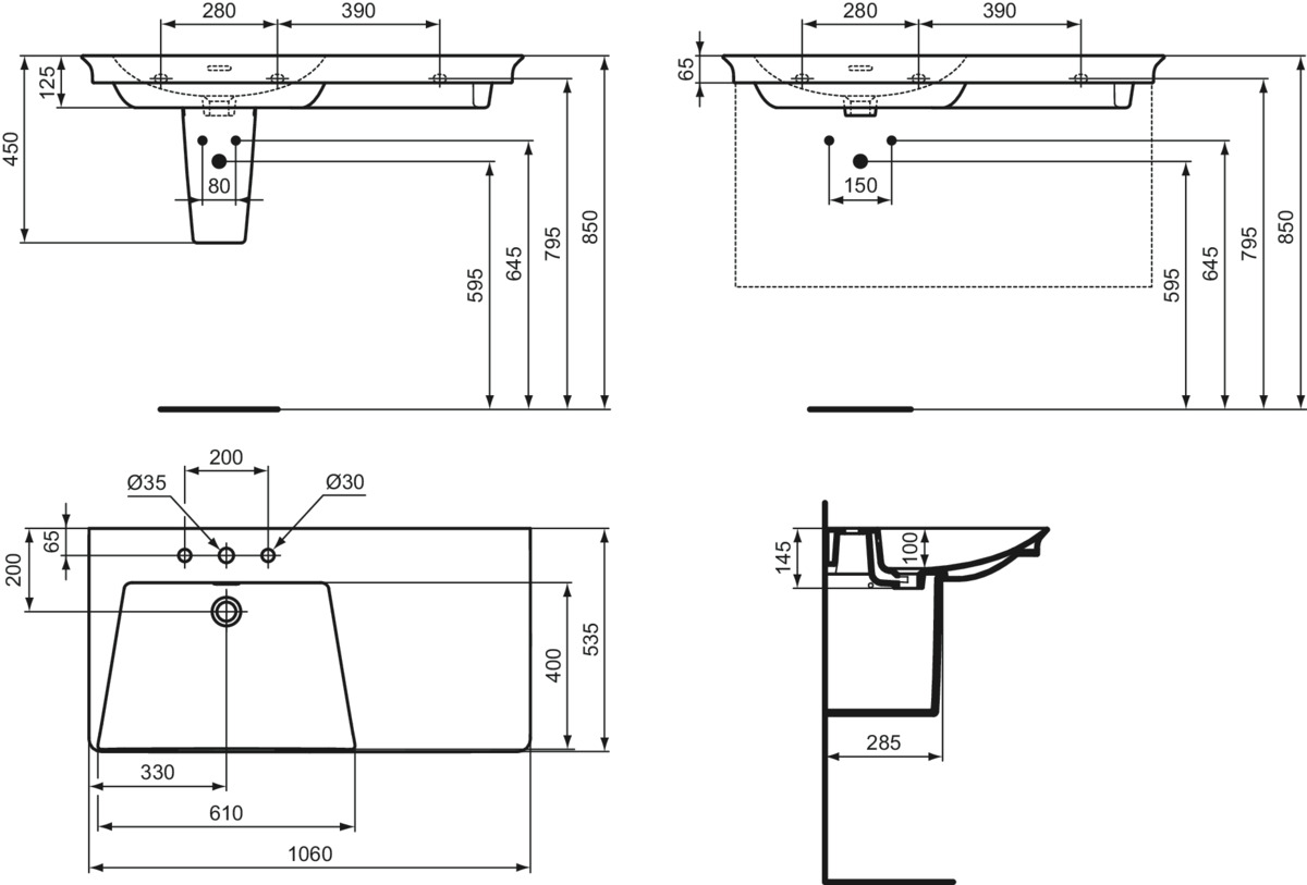 Подвесная раковина La Dolce Vita 106х53,5х14,5 см, левая, с 3-мя отверстиями под смеситель, санфарфор, с отв. под смеситель, Ideal Standard