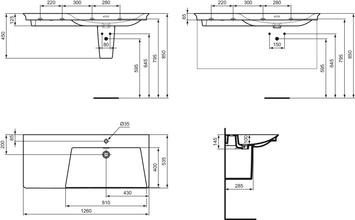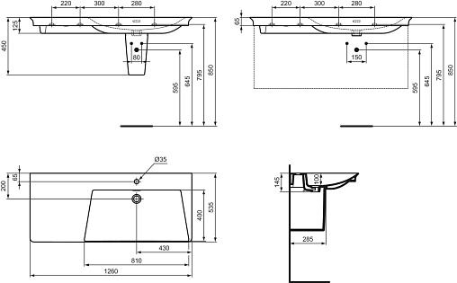Подвесная раковина La Dolce Vita 126х53,5х14,5 см, правая, санфарфор, с отв. под смеситель, Ideal Standard