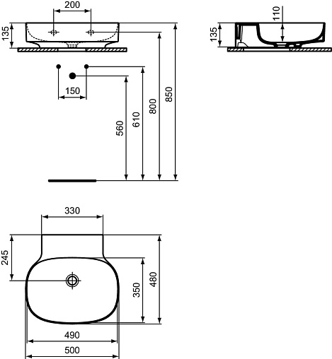 LINDA-X Раковина 50 см без отверстия под смеситель, без отверстия перелива. Технология Diamatec®. Для монтажа со скрытым переливом IdealFlow N8326AA или сливом Free flow E2114xx (заказываются дополнительно). Шлифованный низ, для настенного монтажа с мебелью или столешницей. С монтажным шаблоном. Без крепежа (рекомендованный крепеж - WW965340)