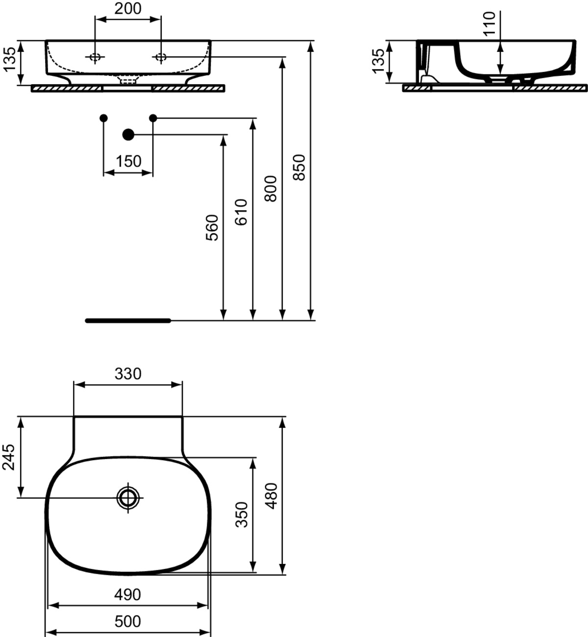 LINDA-X Раковина 50 см без отверстия под смеситель, без отверстия перелива. Технология Diamatec®. Для монтажа со скрытым переливом IdealFlow N8326AA или сливом Free flow E2114xx (заказываются дополнительно). Шлифованный низ, для настенного монтажа с мебелью или столешницей. С монтажным шаблоном. Без крепежа (рекомендованный крепеж - WW965340)