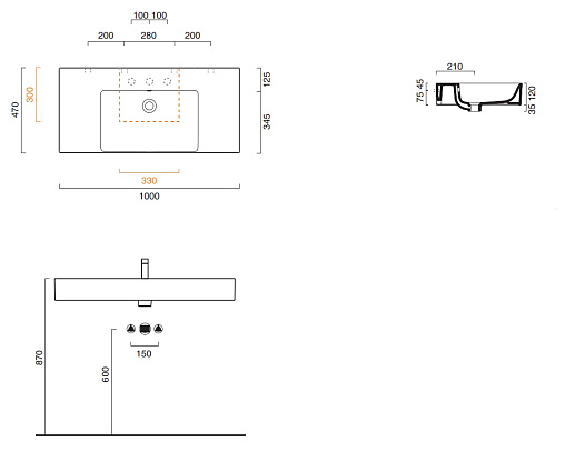 Подвесная раковина New Premium 100х47х12 см, эмаль CataGlaze+® Silver Titanium, санфарфор, Catalano