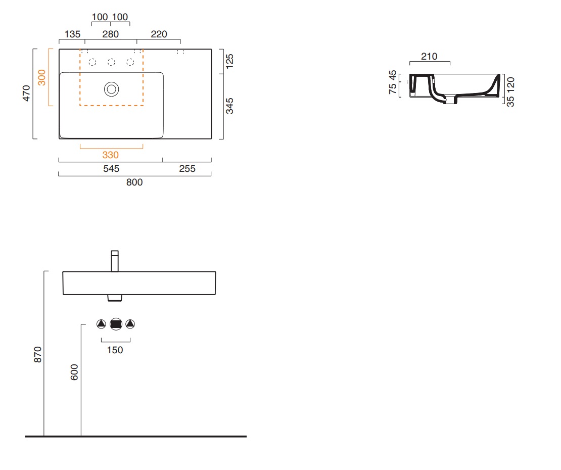 Подвесная раковина New Premium 80х47х12 см, эмаль CataGlaze+® Silver Titanium, левая, санфарфор, Catalano