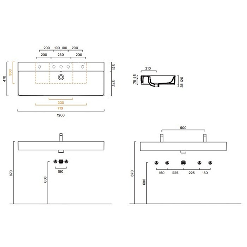 Подвесная раковина Premium 120х47х12 см, покрытие Cataglaze+, санфарфор, белый матовый, с отв. под смеситель, Catalano