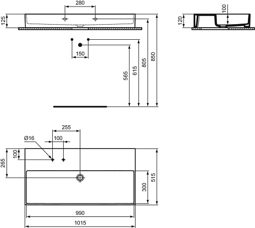 SOLOS Раковина 100х50 см, технология Diamatec®, с 2-мя отверстиями под смеситель SOLOS (ø16 мм), без отверстия перелива, нижняя поверхность отшлифована.