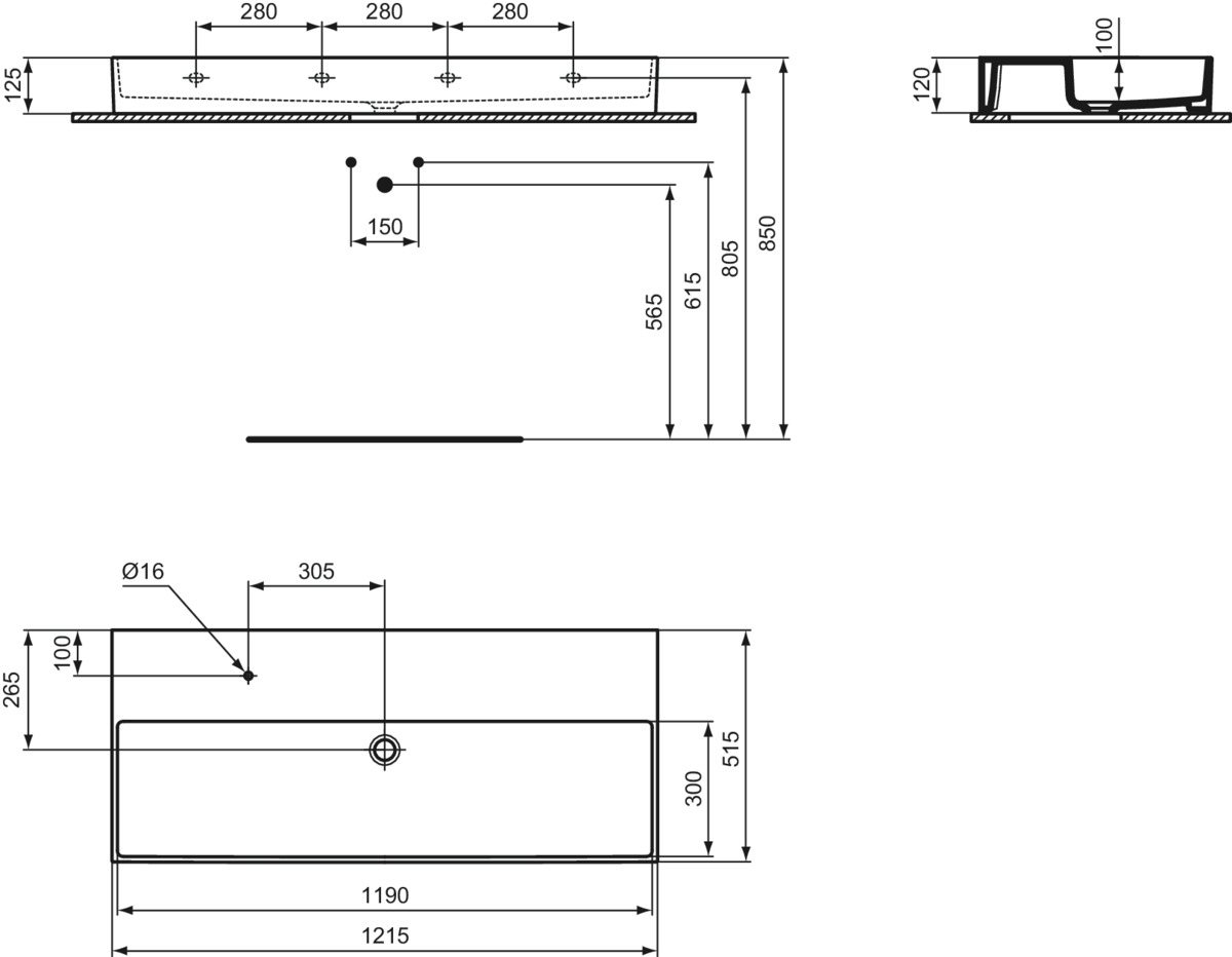 Подвесная раковина Solos 121,5х51,5х12,5 см, для комбинации с электронным изливом Solos на левой стороне платформы, санфарфор, с отв. под смеситель, Ideal Standard