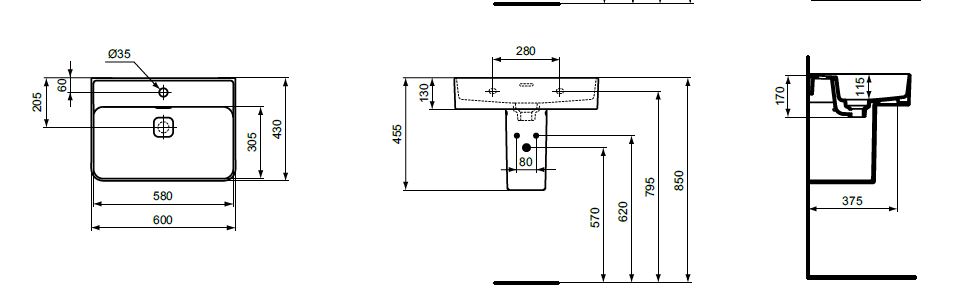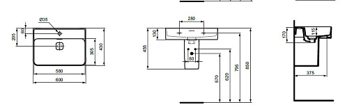 Для монтажа с полуколонной или дизайн-сифоном, с отверстием перелива (щелевого типа), с керамической накладкой слива (T854601).