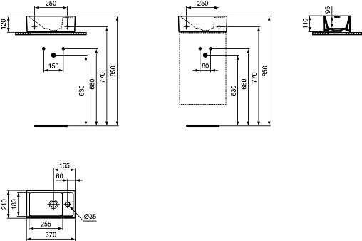 Подвесная раковина Tempo 37х21х12 см, отверстие под смеситель справа, санфарфор, с отв. под смеситель, Ideal Standard