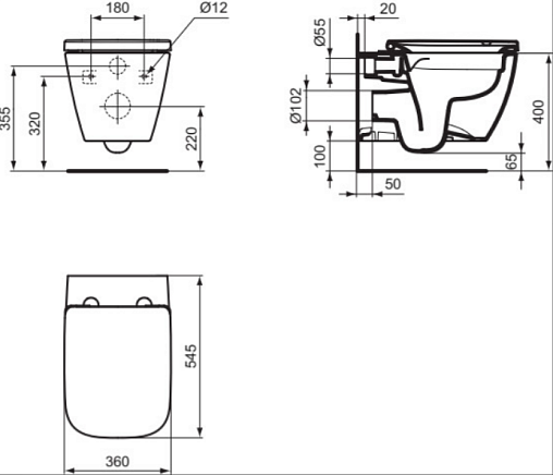 С технологией RimLS+, глубокий смыв, сиденье и крышка T4682 или T4683 заказывается дополнительно, с крепежом (для полностью скрытого монтажа)
