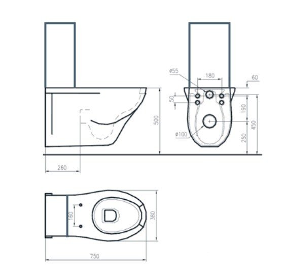 Слив Ø 100 мм в стену. Размеры: 845 мм высота x 380 мм Ширина x 750 мм Глубина.
