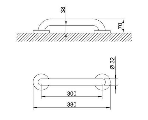 Две опорные точки. Длина (между центрами опор): 300 мм. Диаметр Ø 32 мм, толщина 1,5 мм. 38 мм от стены.