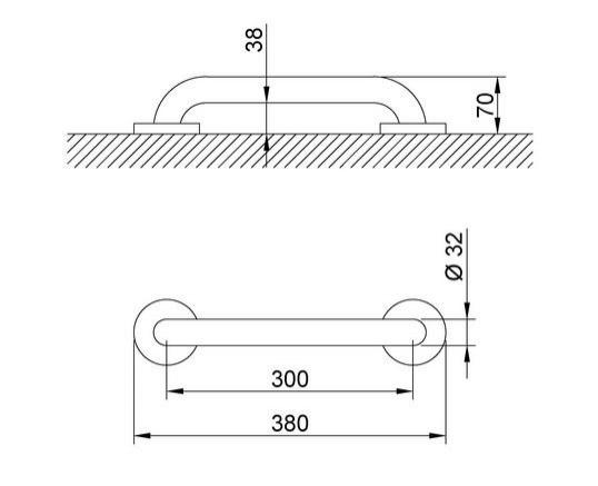 Две опорные точки. Длина (между центрами опор): 300 мм. Диаметр Ø 32 мм, толщина 1,5 мм. 38 мм от стены.