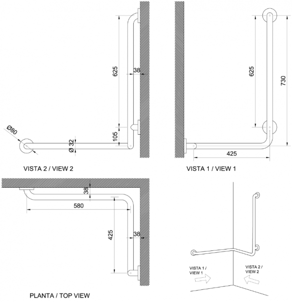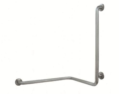 Поручень для установки в угол с тремя точками опоры выполнен из нержавеющей стали AISI 304.