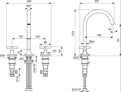 Смеситель для раковины на 3 отверстия Joy Neo графит, без донного клапана, Ideal Standard
