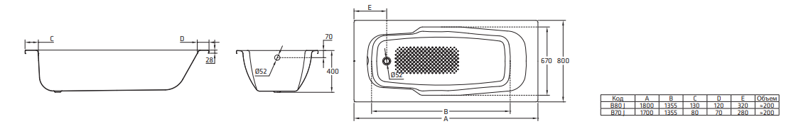 Стальная ванна Atlantica. Размер 170х80 см. С отверстиями для ручек