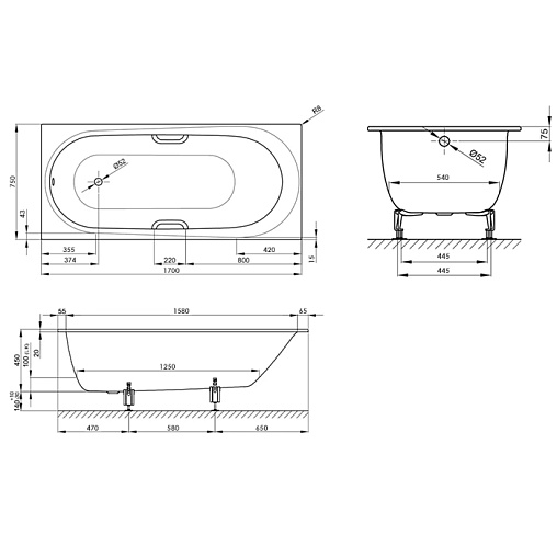 BetteComodo 170х75см, стальная ванна, толщина 3.5мм, без антискользящего, грязеотталкивающее покрытие BetteGlasur® Plus, белый матовый, арт. 1250-440