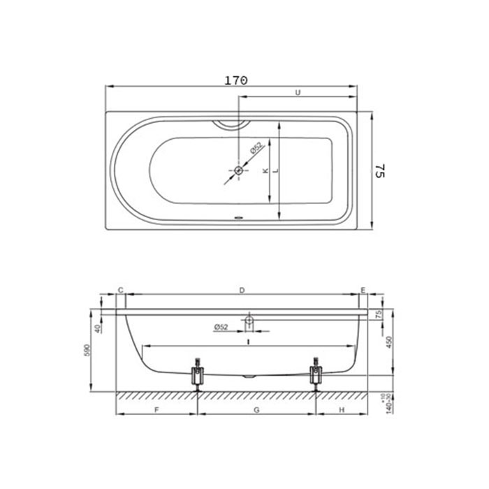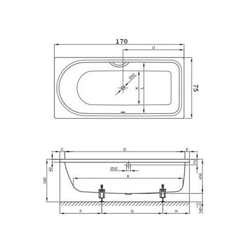 BetteOcean 170х75см, стальная ванна, толщина 3.5мм, без антискользящего, грязеотталкивающее покрытие BetteGlasur® Plus, перелив спереди, арт. 8855-000 PLUS