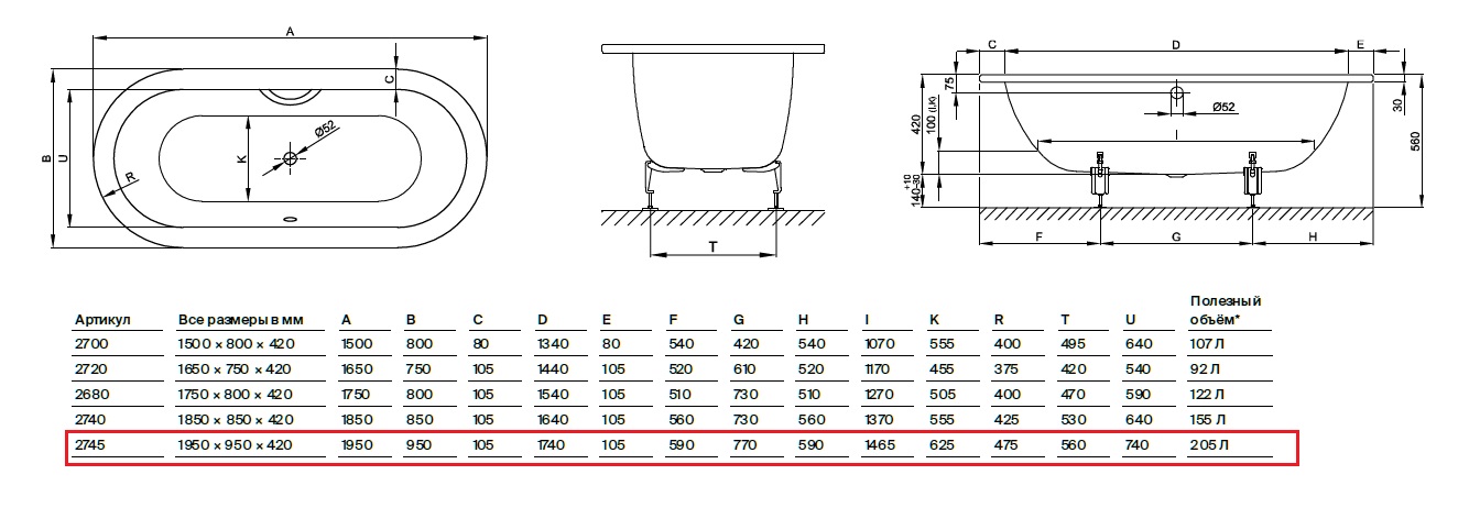 Объем ванны, л.