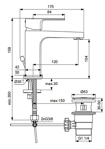 Смеситель для умывальника Cerafine D картридж 28 мм, неповоротный излив, с донным клапаном, Ideal Standard