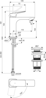 CeraLife C, смеситель для умывальника, неповоротный излив, чёрный цвет, с донным клапаном, холодный старт, матовый, арт. BE047XG, Ideal Standard
