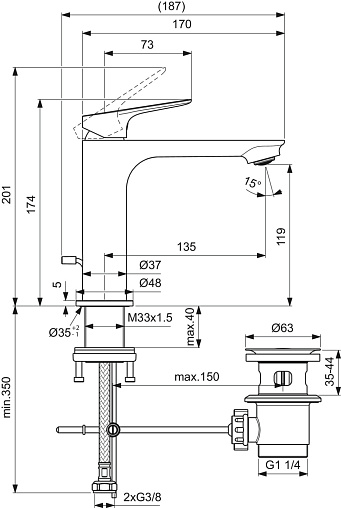 Смеситель для умывальника Ceralife O высота до излива 11,9см, неповоротный излив, с донным клапаном, Ideal Standard