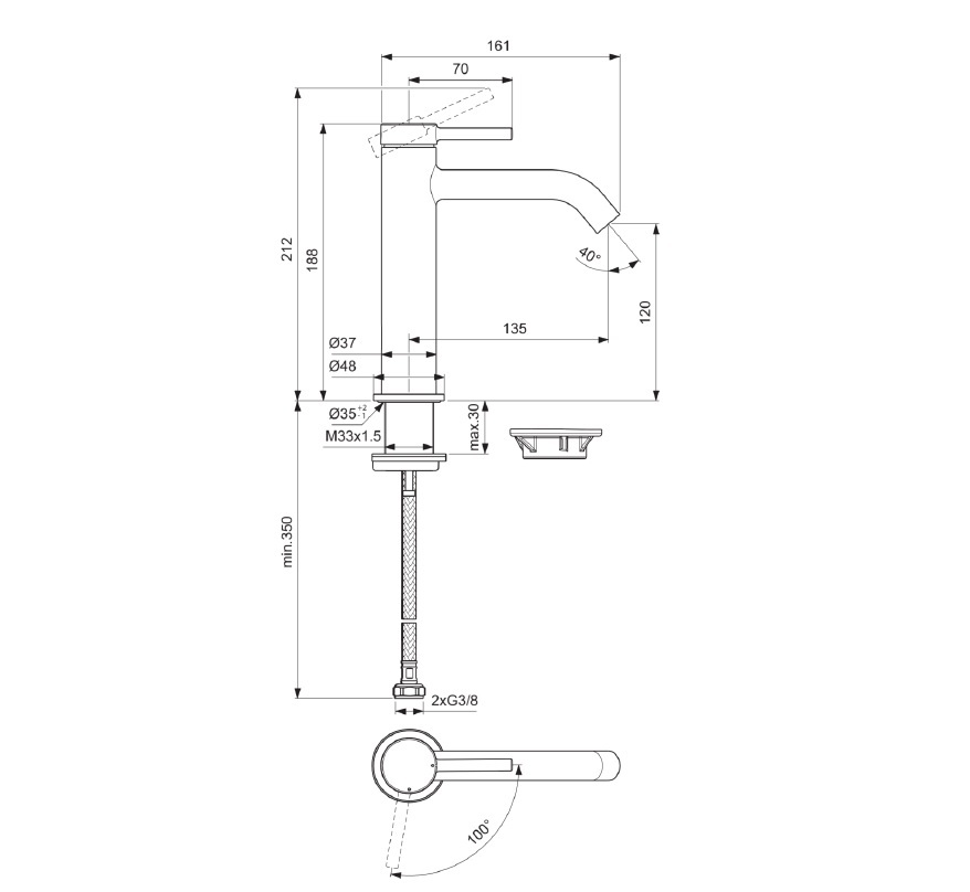 Смеситель для умывальника Ceraline nuovo неповоротный излив, чёрный цвет, без донного клапана, холодный старт, Ideal Standard