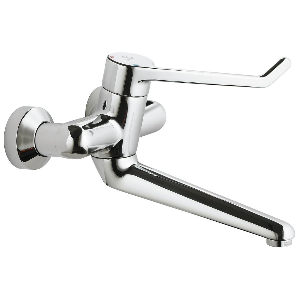 CERAPLUS Настенный смеситель для умывальника с цикловым затвором, монтаж на стандартных эксцентриках с возможностью облегченного демонтажа, с шумопонижателем, рукоятка – 18 см, с индикатором горячей / холодной воды, антивандальный ламинарный аэратор M24x1, картридж 4,7 см с цикловым затвором, с функцией перекрытия горячей воды, излив 20 см, три варианта крепежа излива: фикс. среднее положение, ограниченное движение ±45°, неограниченное движение, герметичные накладки, скрытый монтаж