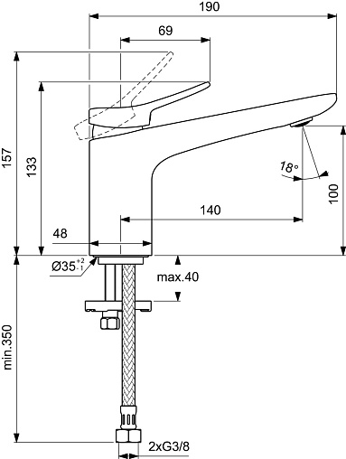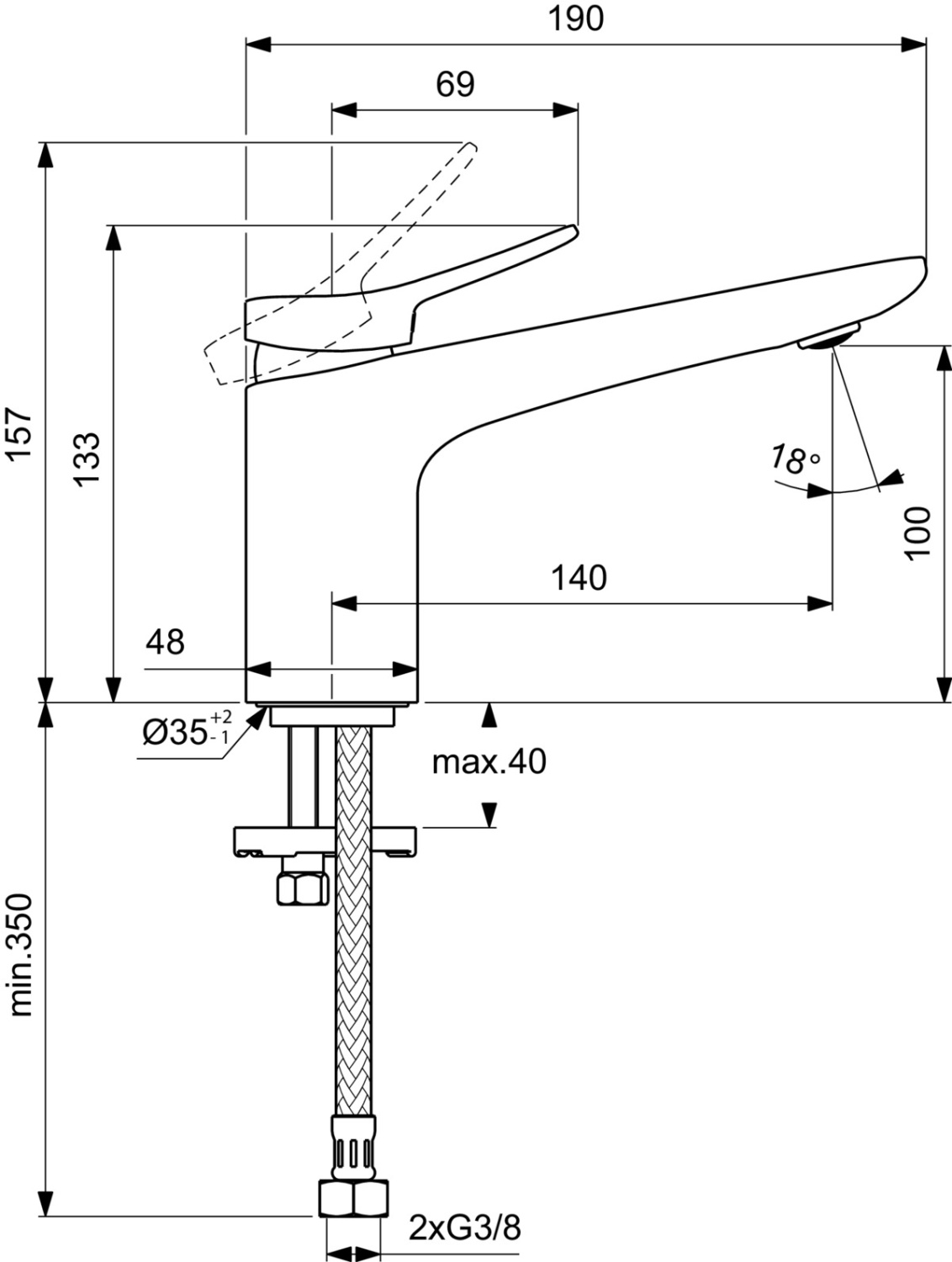 CONCA Grande Однорукоятковый смеситель для раковины без донного клапана, керамический картридж 28 мм, с функцией HWTC (ограничение максимальной температуры горячей воды), без функции CLICK, логотип Ideal Standard на корпусе, металлическая рукоятка без индикаторов горячей/холодной воды, аэратор Coin slot M24x1 с ограничением потока 5 л/мин, система монтажа EASY-FIX (облегченный монтаж), гибкая подводка G3/8" PEX