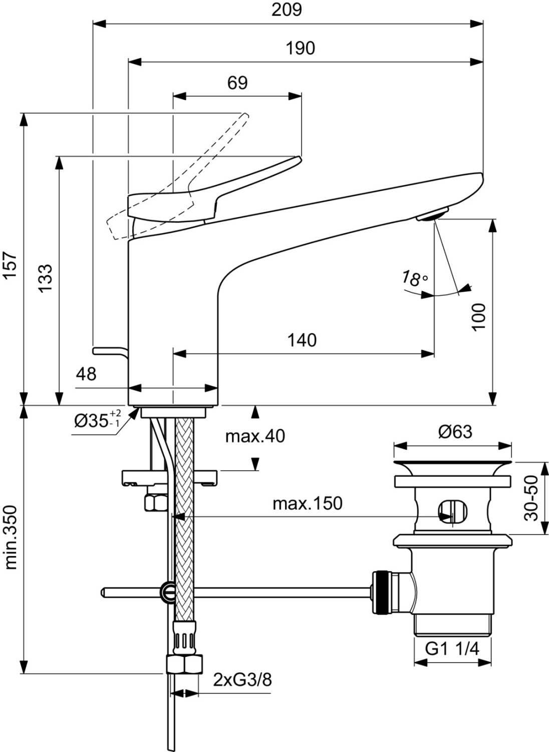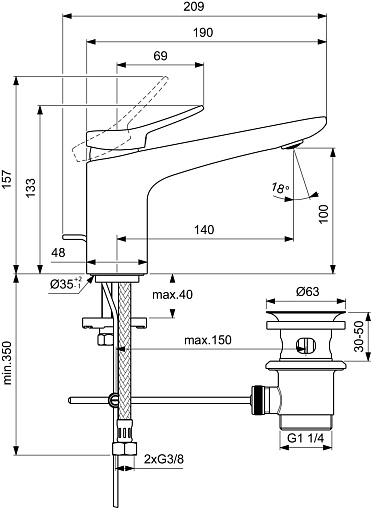 CONCA Grande Однорукоятковый смеситель для раковины с металлическим донным клапаном, керамический картридж 28 мм, с функцией HWTC (ограничение максимальной температуры горячей воды), без функции CLICK, логотип Ideal Standard на корпусе, металлическая рукоятка без индикаторов горячей/холодной воды, аэратор Coin slot M24x1 с ограничением потока 5 л/мин, система монтажа EASY-FIX (облегченный монтаж), гибкая подводка G3/8" PEX. Цветное покрытие - технология PVD