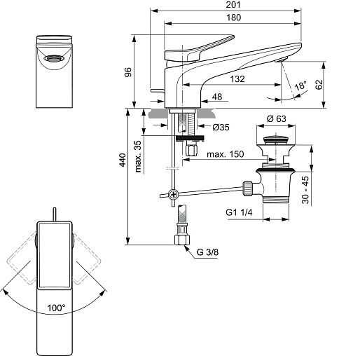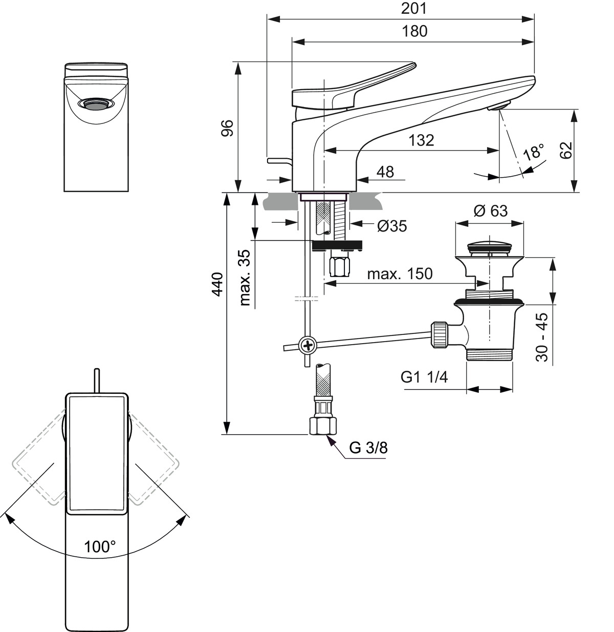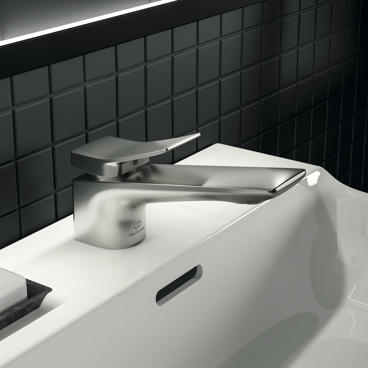 CONCA Однорукоятковый смеситель для раковины с донным клапаном, керамический картридж 28 мм, с функцией HWTC (ограничение максимальной температуры горячей воды), без функции CLICK, логотип Ideal Standard на корпусе, металлическая рукоятка без индикаторов горячей/холодной воды, аэратор Coin slot M24x1 с ограничением потока 5 л/мин., система монтажа EASY-FIX (облегченный монтаж), гибкая подводка G3/8" PEX, металлический донный клапан. Цветное покрытие - технология PVD