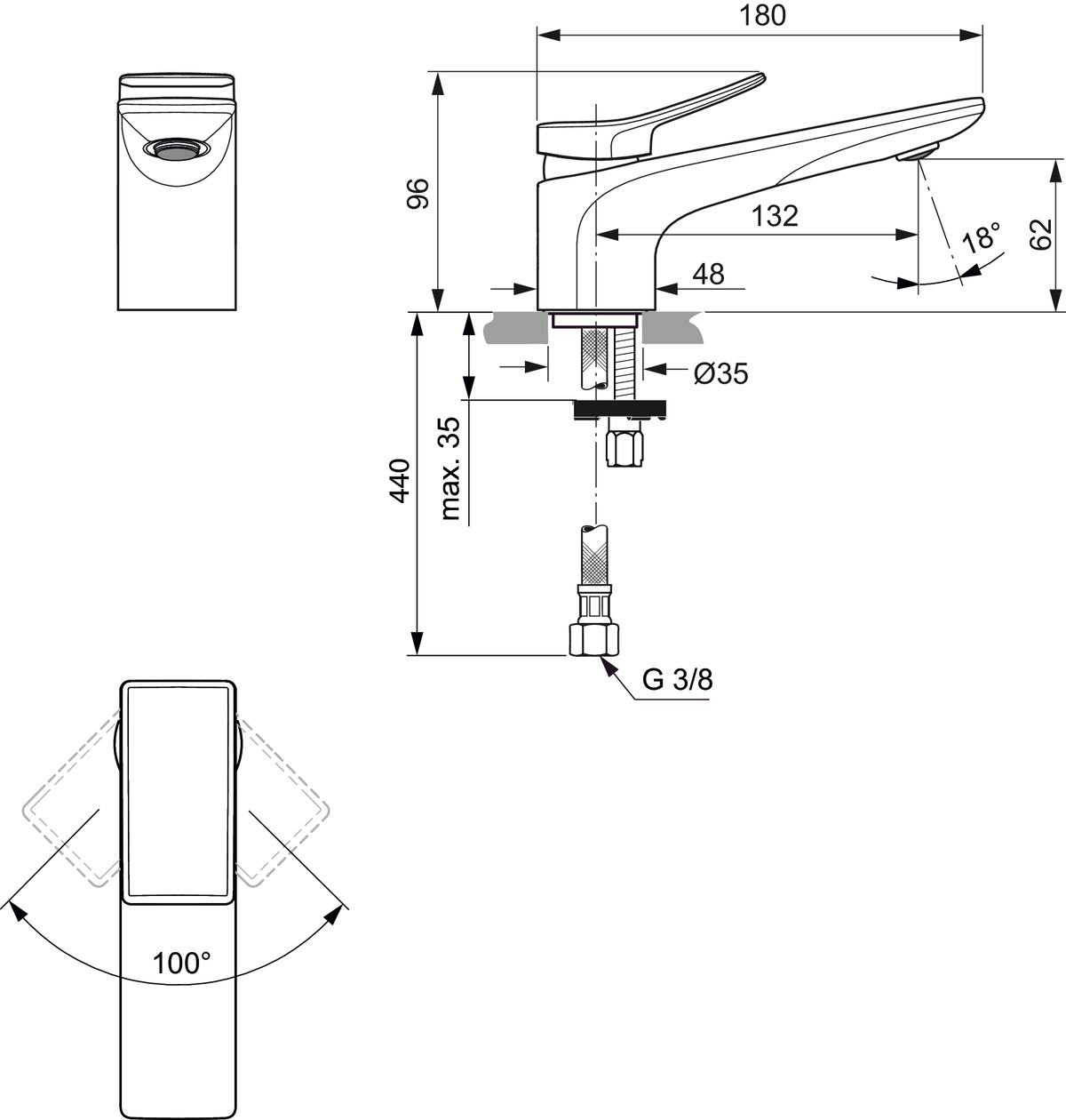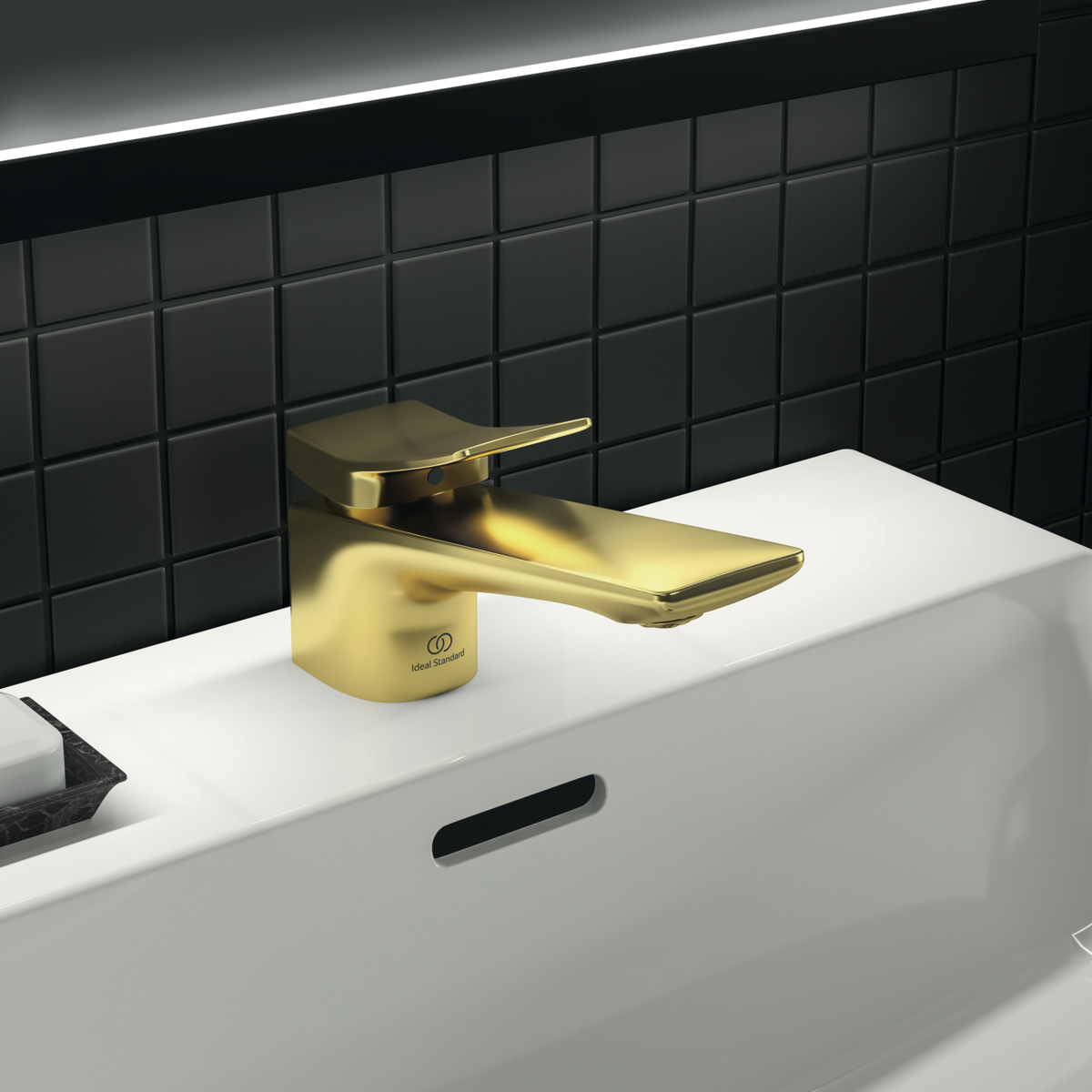 CONCA Однорукоятковый смеситель для раковины, керамический картридж 28 мм, с функцией HWTC (ограничение максимальной температуры горячей воды), без функции CLICK, логотип Ideal Standard на корпусе, металлическая рукоятка без индикаторов горячей/холодной воды, аэратор Coin slot M24x1 с ограничением потока 5 л/мин, система монтажа EASY-FIX (облегченный монтаж), гибкая подводка G3/8" PEX. Цветное покрытие - технология PVD