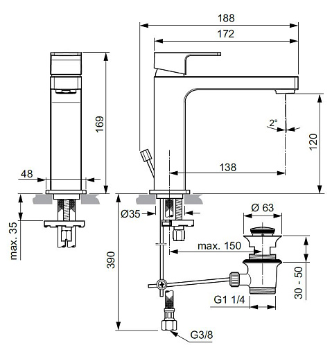 Смеситель для умывальника Edge неповоротный излив, с донным клапаном, Ideal Standard
