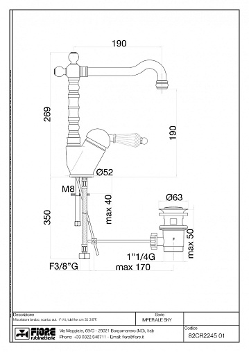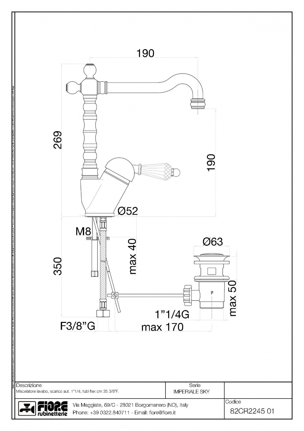 Imperiale Sky, смеситель для умывальника, поворотный излив, с донным клапаном, арт. 82CR2245, Fiore